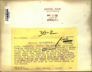 Encircled by conflict, Turkish children play innocently outside a school in Ayios Theodore as two armored vehicles stand guard. British troops of the United Nations Truce Force were ordered to guard the building which women, children and elderly people sought refuge in during the five days of heavy fighting between Turkish and Greek Cypriots. The British also were given the order to return fire if a direct assault was made on the Cyprus School by the Greeks.