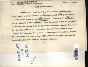 Commander HE Reid. RCN and Lt Commander Hugh Paller, escort a group of members of Parliament aboard the Moby Dick prior to a spin in waters of Halifax harbor. Destroyers of Canadian Navy are outlines in background. Among the members present on the launch can be seen Rene Jutras MP for Provencher, Manitova: Thomas H Ross MP East Hamilton Ontario; LE Cardiff MP North Huron Ontario;Allan Chambers MP Nanimo BC and AC Casselman MP Prescott Ontario. These were part of a group of over members of Parliament who recently inspected harbor facilities and defense at Halifax