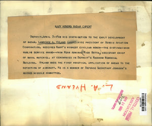 For his contribution to the early development of Radar Lawrence A.Hayland Vice President of Bendix Aviation Corporation receives Navy's Highest Civilian Honor the Distinguished public service award from Rear Admiral Rico Botta, Assistant Chief of Naval Materiel at ceremonies in Detroit Rackham Memorial Bldg. Hyland made the first practical application of Radar to the detection of aircraft. He is a member of Defense Secretary Johnson's guided Missile Committee.
