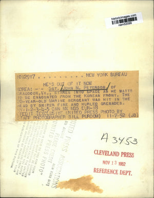 Sgt John N Peterson of Graddock, VA stared into space as he waits to be evacuated from the Korean front. The 20 year old Marine Sergeant was hit in the head by sniper fire and hurled grenades.