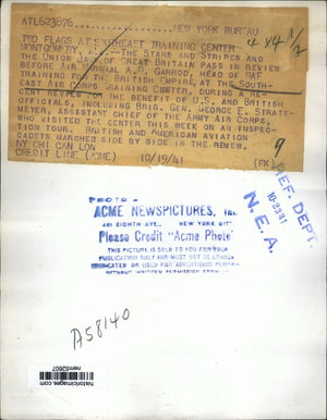 The Stars and Stripes and the Union Jack of Great Britain pass in review before Air Marshal AR Garrod, head of RAF Training for the British Empire at the Southeast Air Corps Training Center during a recent review for the benefit of US and British officials, including Brig Gen George E Stratemeyer Assistant Chief of the Army Air Corps, who visited the center this week on an inspection tour. British and American Aviation Cadets marched side by side in the review.