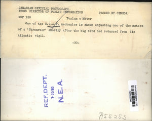 Tuning A Motor One of the R.C.A.F. mechanics is shown adjusting one of the motors of a 'Stranraer' shortly after the big bird had returned from its Atlantic vigil.