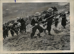 British Sailors shown at an East Coast Base during training in landings under enemy fire. They are also schooled in hand to hand bayonet combat.