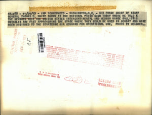 Air Force Chief of Staff Gen Thomas D White shown at the National Press Club where he told newsmen that the U.S. Intercontinental and medium range ballistic missiles are fast approaching the stage where they could be used in combat and have been assigned to the strategic air command for operation.