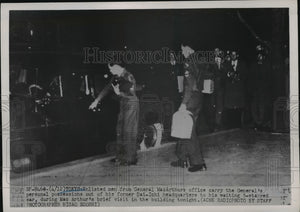 Tokyo Japan Enlisted men from Gen MacArthur's office carry the General's possessions out of his former Dai Ichi headquarters to his waiting 5 starred car, MacArthur's brief visit in the building tonight