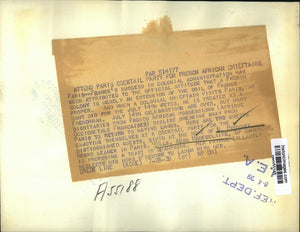 Paris France's success is colonial administration has been attributed to the official attitude that a French colony is merely an extension of the soil of France proper. And when a colonial chieftain visits Paris, as many did for the July 14th fetes, he is treated as a Frenchman. July 14th celebrations are over but many dignitaries from French African possessions dislike breaking away from Paris to return to native lands. Here are two guests enjoying themselves at a cocktail party for the distinguished guests, given at the home of M. Provost, leader in Paris. Mlle Xuan Madeselaire, of Cameroun, is proposing a toast in champagne. Her friend gallantly neglects his hors D' Oeuvre to laugh with her.