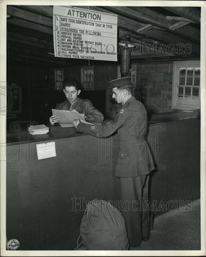 The records which Sgt Freund has brought in a sealed envelope are scrutinized by Pfc Leonard Gittler at the Initial Receiving Point. The clerk makes certain that everything is in order, that nothing is missing, and that the bearer possesses the proper identification tags. After a complete examination of all records and orders, Pfc Gittler hands Sgt Freund a booklet called "What Next?" which explains separation procedure and tells what to expect during the short stay in the center.