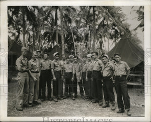 These U.S. soldiers were manning the automatic guns on the Helena when it was sunk by Japanese torpedoes. Here, outside the Marine Corps tents where they are living in a coconut grove at a South Pacific base are LTR: J.J. Ebnet; W.R. Barnett; G.Q. Hughes; O.E. Tumlin; L.R. Gross; N. Spehar; J. Summers; F.G. Smith; M.E. Dunbar; L.B. Turner; T. Tizard, Jr.; G.M. Sillings; D.Di Carlos and J. Kneeland.