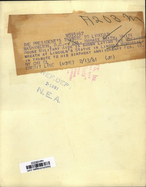 The President's tribute to Lincoln Washington, D.C. -- Col. Horace Smith, White House Military Aide is shown laying the President wreath at Lincoln's Statue in Lincoln Memorial in tribute to his birthday anniversary Feb. 12.