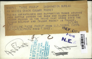 Allied Infantrymen and supporting tanks advance into battle across the snow and slush covered col-mar plains in the drive that broke open the German salient and col-mar pocket in France.