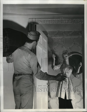 1946 Press Photo Corporal Hugh Horner greets mannequin in New York apartment