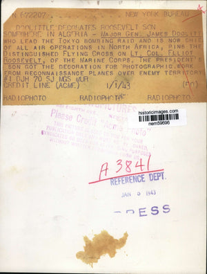 Major General James Doolittle who lead the Tokyo bombing raid and is now chief of all air operations in North Africa, pins the Distinguished Flying Cross on Lt. Col. Elliot Roosevelt, of the Marine Corps. The president's son got the decoration for photographic work from Reconnaissance planes over enemy territory.
