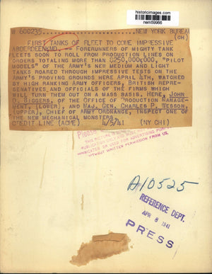 Forerunners of mighty tank fleets soon to roll from production lines on orders totaling more than $250,000,000, "pilot models" of the Army's new medium and light tanks roared through impressive tests on the Army's proving grounds here April 4th, watched by high ranking Army officers, British Representatives and officials of the firms which will turn them out on a mass basis. Here, John Biggers, of the Office of Production Management and Major General Charles Wesson, Chief of Army Ordnance, inspect one of the new mechanical monsters.