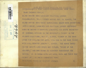 Philadelphia- Former Marine Sgt. Al Schmid the Blind Marine Hero whose Guadalcanal Deeds were dramatized into a movie launched his political Career when he became a surprise candidate for State Secretary of Internal Affairs on the Democrat Ticket in the Primary Elections. Schmid a winner of the Navy Cross for killing 200 Japanese will run on the same ticket with U.S. Senator Joseph F. Guffey. The Movie based on the Hero's life story was titled Pride of the Marines and was shown in Theaters throughout the Nation. Al is shown with his wife Ruth and their Son Albert Jr.