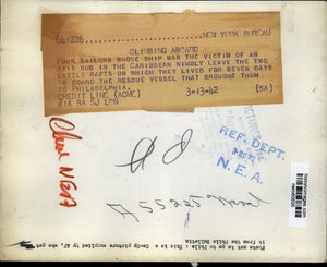Four sailors whose ship was the victim of an Axis sub in the Caribbean nimbly leave the two little rafts on which they lived for seven days to board the rescue vessel that brought them to Philadelphia.
