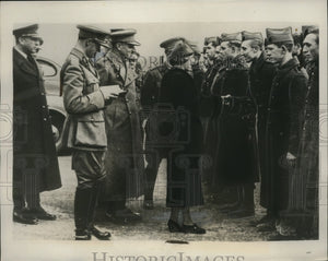 Queen Elizabeth of Belgium greets a Army at Belgian Cantonment during recent tour of Troops that have been called up to protect Belgian Neutrality.