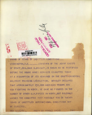 Chairman of the Joint Chiefs of Staff, General Omar N. Bradley is shown as he testified before the House Armed Services Committee today at a resumption of its hearing on the draft universal Military training Legislation. Bradley declared that approximately 250,000 American Troops are now fighting in Korea. He gave no figures on the number of other U.N. Forces in Korea but solemnly warned the committee that possibly ten or twenty years of unsettled international conditions may be expected.