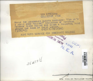 While the assembled guests chorused:"For he's a jolly good fellow" Collector of Internal Revenue Clark Squire was given a triumphal ride around the room by these ladies.