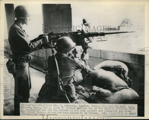 Seoul Korea: Pvt. L. Pomeroni, Kewosha, Wisc., (L), and Pfc. E.D. Coyi, Melrose, Mass., set up their 50 caliber machine gun in the Capitol Building here in preparation for the defense of the city against new Communist assaults. The latest Chinese attack has been halted by UN forces.