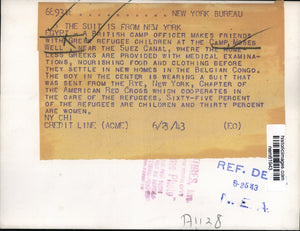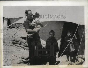Egypt- A British Camp Officer makes friends with Greek Refugee Children at the Camp Moses Well near the Suez Canal where the homeless Greeks are provided with Medical Examinations nourishing food and clothing before they settle in New Homes in the Belgian Congo. The Boy in the center is wearing a suit that was sent form the Rye New York Chapter of the American Red Cross which cooperated in the care of the refugees. Sixty percent of the refugees . Sixty five percent are Women