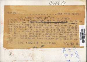 1942 Press Photo General Asa Ducan of American Army Air Force arrives London