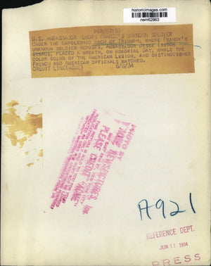 Under the Napoleonic Arch of Triumph, where France's unknown soldier reposes Ambassador Jesse Isidor Straus, placed a wreath, on memorial day, while the color guard of the American Legion and Distinguished French and American officials watched.
