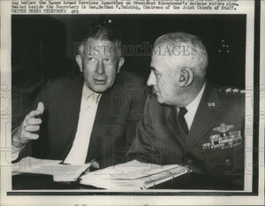 Defense Secretary Neil McElroy returned 4/23 for further questioning before the House Armed Services Committee on President Eisenhower's defense reform plan. Seated beside the Secretary is General Nathan Twining, chairman of the Joint Chief of Staff.