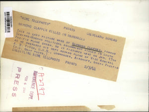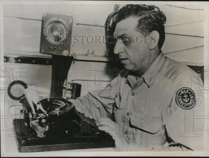 This is last picture made of Raymond Clapper, famous Scripps-Howard Political Solumnisht killed in South Pacific plane crash. He is pictured here on Jan. 17th as he prepared his copy aboard plane of Vice Admiral A.W. Fitch. U.S.N. Commander, Aircraft, South Pacific.