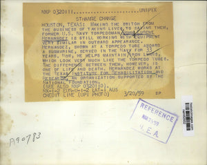 Houston Texas: Making the switch from the Business of taking Lives saving them former U.S Navy Torpedoman John Eugene Hernandez is still working with the equipment very similar in outward appearance. Hernandez shown at a torpedo tube aboard a submarine served in the Navy for 33 years. Now he helps maintain Iron Lungs. Which took very much like the torpedo tubes. The Difference between them however is one of the life and death. Hernandez works at the Texas Institute for Rehabilitation and Research and Organization supported by the National Foundatio.