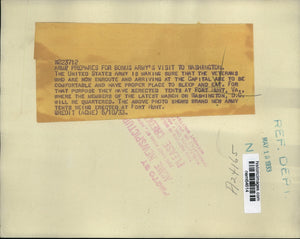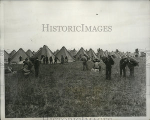 The United States Army is making sure that the veterans who are now en route and arriving at the Capital are to be comfortable and have proper place to sleep and eat. For that purpose they have erected tents at Fort Hunt, Va., where the members of the latest march on Washington, D.C. will be quartered. The above photo shows brand new army tents being erected at Fort Hunt