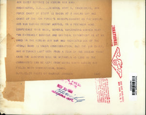 Air Chief Reports on Korean Air War Washington, D.C......General Hoyt S. Vandenberg, Air Force Chief of Staff is shown at a Korean map and chart of the Air Force's accomplishment in the Korean Air War during recent months. In a Pentagon news conference this week, General Vandenberg warned that "an extremely serious and critical situation" is at hand in the Korean Air War and indicated use of the atomic bomb is under consideration. But the Air Chief who returned last week from a tour of the Korean front said the A-weapon will be withheld as long as the Communists can be kept from using North Korean Air Fields with conventional bombs.