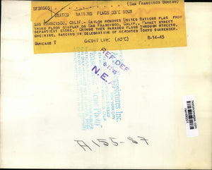 Sailor removes United Nations Flag from third floor display on San Francisco California, market street department store. Crowds then paraded flags through streets cheering, dancing in celebration of reported Tokyo surrender.