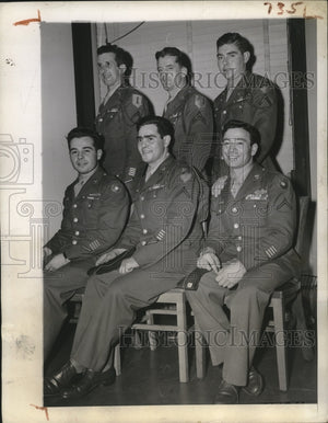 After seeing more than two years of action and participating in three invasions, these six Yanks are back in the US to tour the country and boost the sale of bonds and production pf war materials. Left to right: Pvt. Euripidis Jamoulis, Brockton Mass.; Pfc. Vincent Rommano, Brooklyn New York; Pfc. John Krasnowski, Avenel, NJ; Cpl. Joseph Rostohar, Wooster New York and Pfc. Fred Sparks, LaFollette, Tennessee