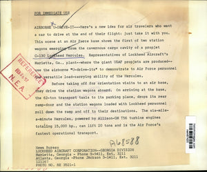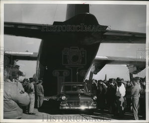 Here's a new idea for air travelers who want a car to drive at the end of their flight; just take it with you. This scene at an Air Force base shows the first of two station wagons emerging from the cavernous cargo cavity of a propjet C-130 Lockheed Hercules.