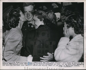 Sgt Upton S Ward, Coos Bay, OR, just returned from Korea on the USS Lt Raymond Beaudoin, is given a warm greeting by kinfolk assembled on dock.. L-R are Mrs Ruth Lancaster, his Aunt, Sgt Ward, Lois Lacy, his mother, and wiping tears of joy is Nancy, his cousin.