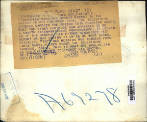 Washington When Gen Dwight D Eisenhower made his recent report to the nation on his European tour,the TV cameras carried the speech into American homes. What video audience saw appeared to be a smooth performance.. It looked as if General had either memorized his report or was making it up as he went along. Actually Ike was reading his address from large cards placed under the TV cameras. Above this is what the public saw as Gen Eisenhower delivered his speech.
