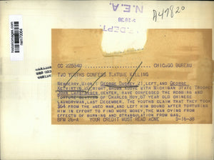George Duchey, 21 (left) and George Ketvirtis, 20 (right), shown above with Michigan Station Trooper John Carstensen (center) have confessed the robbing and torture slaying of Charles Hoy, 67 year old Chinese laundryman, last December. The youths claim that they took $64 from the aged man and left him bound after torturer him in effort to find more money. The man dying from effects of burning and strangulation from gag.