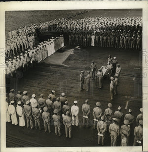 1943 Press Photo Vice Adm AW Fitch presents awards on carrier in S Pacific