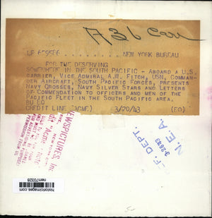 Somewhere in the South Pacific Aboard a US carrier, Vice Admiral AW Fitch USN Commander Aircraft, South Pacific forces, presents Navy Crosses, Navy Silver Stars and Letters of Commendation to officers and men of Pacific Fleet in South Pacific area,