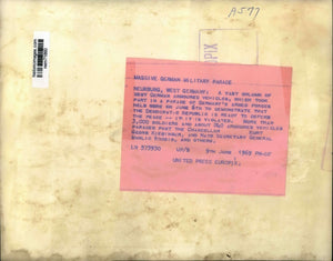 Massive German Military Parade Neurburg, West Germany: A vast column of West German armoured vehicles, which took part in a parade of Germany's armed forces held on June 6th to demonstrate that the Democratic Republic is ready to defend the place -- it is violated. More than 3,000soldiers and about 240 armoured vehicles paraded past the Chancellor Kurt Georg Kiesinger, Nato Secretary General Manlio Brosio, and others.