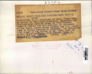 Secretary of Navy Frank Knox on behalf of President Roosevelt, presented the Distinguished Service Medal to Vice Admiral Henry Hewitt for his services as Commander of the Naval Forces which covered the US Landings in French Morocco in November. The ceremonies took place in the office of Mr. Knox. Left to right Secretary Knox, Vice Admiral Henry K. Hewitt and Mrs. Hewitt.