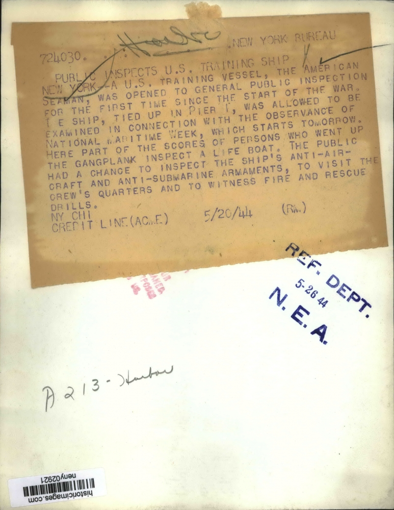 A U.S. training vessel, the American Seaman, was opened to general public inspection for the first time since the start of the war. The ship, tied up in Pier I, was allowed to be examined in connection with the observance of National Maritime Week, which starts tomorrow. Here part of the scores of persons who went up the gangplank inspect a life boat. The public had a chance to inspect the ship's anti-aircraft and anti-submarine armaments, to visit the crew's quarters and to witness fire and rescue drills. Photo measures 7 x 9 inches. Photo is dated 05-20-1944.