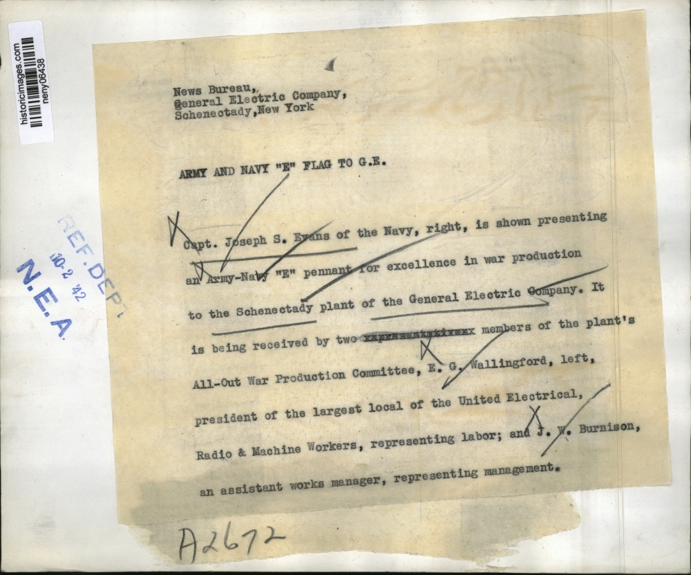 Capt Joseph S Evans of the Navy right is shown presenting an Army-Navy E pennant for excellence in war production to the Schenectady plant of the General Electric Company.It is being received by two members of the plants A