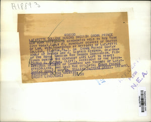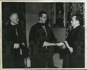 In ceremonies held in NYC today, Honorary Degrees of Doctor of Law, were conferred by Officers of LaFayette College, on Crown Prince Gustav Adolf of Sweden & J. Sigfrid Edstrom, Chairman of the Royal Swedish New Sweden Comm. Pictured during the ceremony are LTR: Thomas J Watson (L); Crown Prince Gustav Adolf and Dr William Mathery Lewis (R).