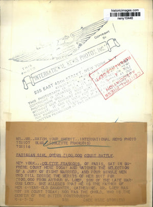 Collette Francois of Paris sat in Supreme Court here today and watched the selection of a jury of 8 married, and 4 single men who will decide the merits of her suit for $100,000 from Arthur M Loew son of the late Marcus Loew theater magnate. She alleges that he is the father of her 4 year old daughter Catherine. Mr Loew was not in court today nor was the cchild who is the center of the bitter controversy