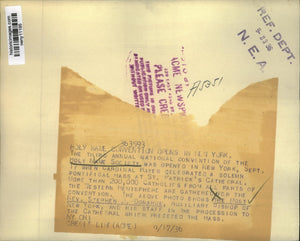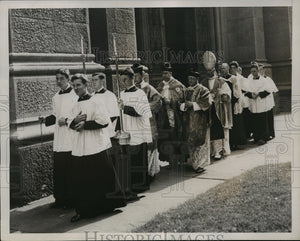 The third annual National convention of the Holy Name Society was opened in NY Sept 17 when Cardinal Hayes celebrated a solemn pontifical mass at St Patrick's Cathedral. More than 200,000 catholics from all parts of the western hemisphere are gathered for the convention, The Most Rev stephen J Donahue auxillary Bishop of NY and his staff in the procession to the ccathedral which preceeded the mass