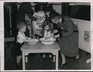 Local members of the National Federation of Day Nurseries observed conditions at the Manhattanville Nursery 131st Street and Old Broadway New York City March 25. Photo shows Mrs Philip M Stimson President of Manhattanville Nursery showing a youngster how to wash his little sister - demonstrating on a doll.