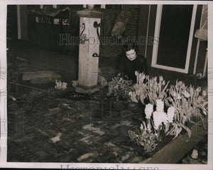 INDISPUTABLE EVIDENCE OF THE NEARNESS OF SPRING, WAS THE OPENING OF THE ANNUAL INTERNATIONAL FLOWER SHOW AT GRAND CENTRAL PALACE, NEW YORK CITY, MARCH 16. PHOTO SHOWS MISS GERTRUDE WILSON,PUTTING THE FINISHING TOUCHES ON A DISPLAY SPONSORED BY THE NEW ROCHELLE GARDEN CLUB.