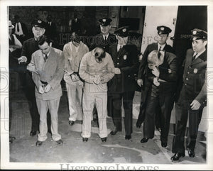 White Plains NY The 1st degree murder trial of Charles McGale,45, Edward Kiernan,32, William Wade, 32 and Joseph Riordan,25 shown left to right in custody of Sing Sing prison guards Involved in teh Sing Sing jailbreak last April 14 when a prison guard, an Ossining patrolman and 1 of the fugitive prisonerr were shot to death opened today in the heavily guarded courtroom in White Plains