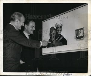 District Attorney Thomas E Dewey National campaign chairman of teh United Service Organizatio for National Defense admires a painting by Howard C Renwick on left portrait and commercial artist. Renwick contributed theoil painting for reproduction on posterrs and other ad matter in the USO's drive for $10,765,000 with which to operate more than 360 service clubs near Army and Navy camps and defense industries, The campaign will be launched formally on June 3rd